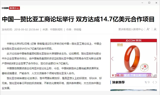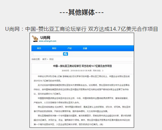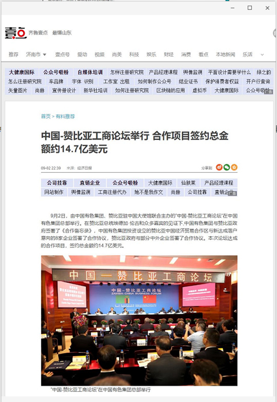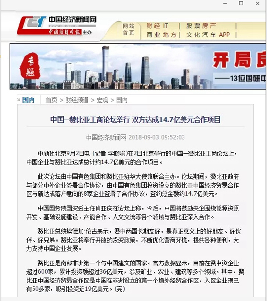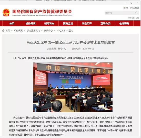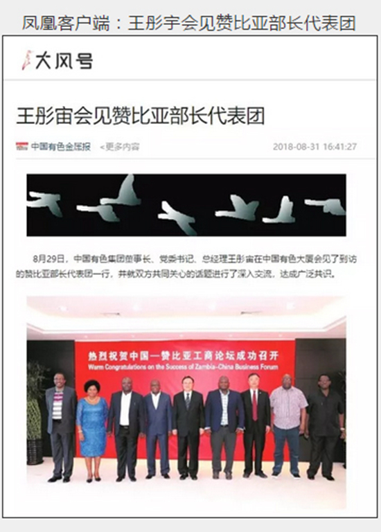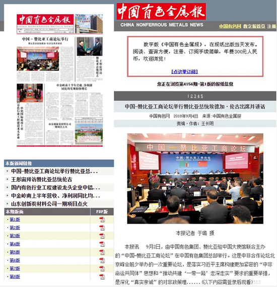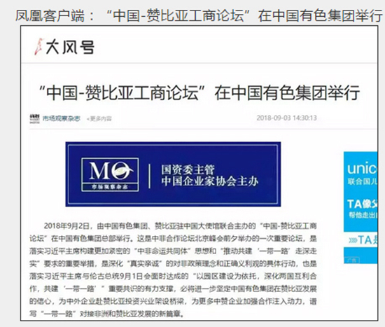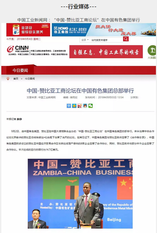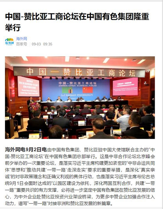 2018年9月2日,由中國有色集團、贊比亞駐中國大使館聯合主辦的“中國-贊比亞工商論壇”在中國有色集團總部舉行。中非合作論壇成立18年來,中贊經貿合作得到了長足發展。中國有色集團在贊比亞的投資合作也邁上了新高度,總投資近30億美元,擁有14家各級企業,一批重點企業和項目脫穎而出。